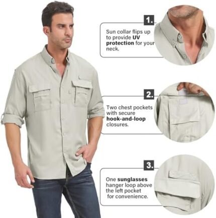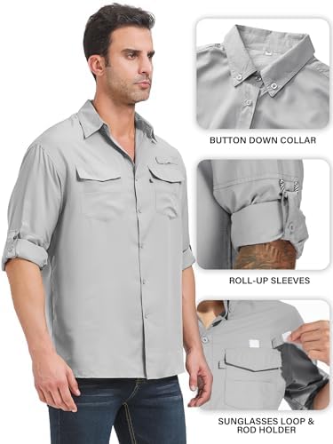 Mens Safari Shirts Long Sleeve Fishing Shirt Sun Protection UPF 50 UV Quick Dry for Hiking Outdoor Camping Travel