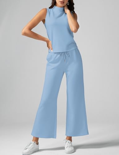 Funlingo Women’s 2 Piece Outfits Summer Sleeveless Mock Neck Tops Wide Leg Crop Pants Lounge Set 2024 Trendy Clothing