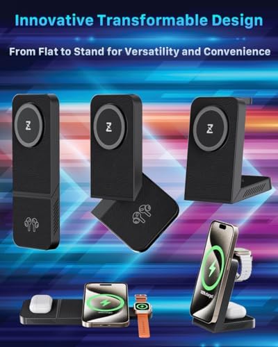 MagFree Transform 3-in-1 Fast Wireless Charging Station Multiple Devices, 15W Magnetic Travel Charger Stand for iPhone 15/14/13/12, 5W Apple Watch Fast Charger, AirPods- 30W USB-C Charger Included