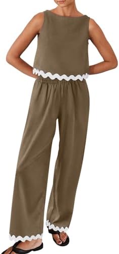 Women’s Summer 2 Piece Outfits Casual Linen Crop Tank Tops with Wide Leg Pant Sets Lounge Beach Travel Sets