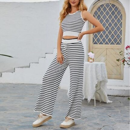 Women’s Two Piece Sets Summer Sleeveless Crop Tops Wide Leg Pant Sets