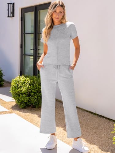 2 Piece Lounge Sets for Women Slim Fit Short Sleeve Tops High Wide Leg Pants Tracksuit Pajama Outfits