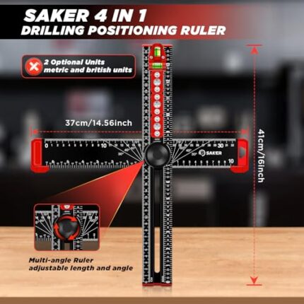 Saker 4-in-1 Drilling Positioning Ruler, Adjustable 13.78in Multifunctional T Square Ruler, Cabinet Hardware Jig, Marking Gauge Tools for Woodworking, Cabinet Drawer Door Hole Drilling Template