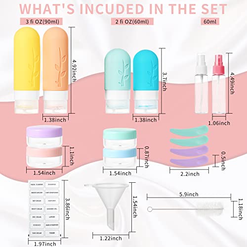 ✈️【Designed for Travel accessories】Our 18pack reusable travel bottles set with 1 waterproof bag, 2 pcs silicone bottles (3oz/90ml), 2 pcs silicone bottles(2oz/60ml), 2 pcs spray bottles(1.05oz/30ml), 4 pcs cream jars(0.35oz/10ml), 1pcs funnels, labels, brush and 2 pcs spatula!Different accessories for your different needs
