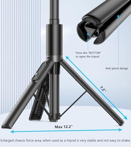 【Stable Tripod】 The phone tripod utilizes the principle of triangular stability, while increasing the chassis force area, increasing the moment of force, When it is used as a tripod it can be very stable and not easy to shake. One button unlock tripod design, it does not require complicated assembly, just press the BUTTON button at the bottom to unlock the tripod easily. The tripod is equipped with anti-slip pads for greater stability when unfolded.