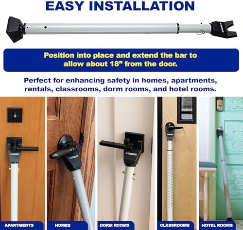 SETUP. Easy to install and remove, simply prop the bar under the door knob or between the sliding or hinged doors for extra security. The security bar expands from 25” to 43”, ensuring a snug and tight fit against the door