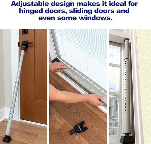The Brinks Dual-Functioning Door & Sliding Door Security Bar provides heavy-duty security for hinged, patio, and sliding doors to prevent forced entry. The quick and simple installation requires no tools. The door security bar adjusts in 40 different positions between 27” and 44.5” to fit most doors. It is constructed of 20-gauge heavy-duty steel for extra strength and security. The non-marring top yoke and pivoting padded foot protect your floors, doors, and locks while providing optimal security. This product works best on tile, wood, and concrete floors. The mobile and compact design makes this door security bar great for home, dorm room, travel and more. This comes with a lifetime warranty.