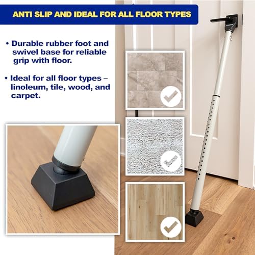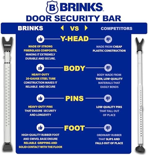 FEATURES.Brink’s Door Security Bar has a sturdy construction and features a non-marring top yoke and a pivoting padded foot