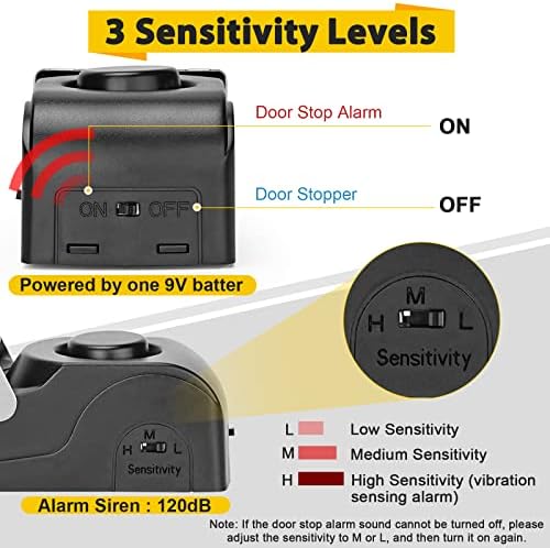 ow – Medium – High, with an adjustable sensitivity switch on the side, and can be adjusted according to different situations. H level is the most sensitive level that vibration will trigger an alarm.Please note when the alarm sound gradually becomes smaller, it means replacing the new battery