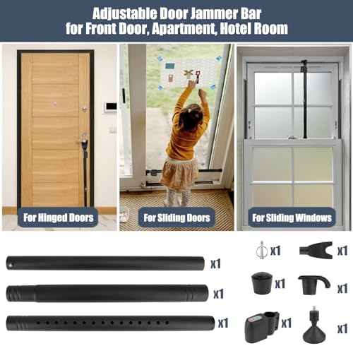 【What’s Included】 Door Safety Bars (2 pcs), Y-shaped Head (1 pcs), L-shaped Head (1 pcs), Bases(2 pcs), Alarm(1 pcs), Pin(1 pcs). The adjustable door security bar is removable, making it easy to take on trips or store at home.