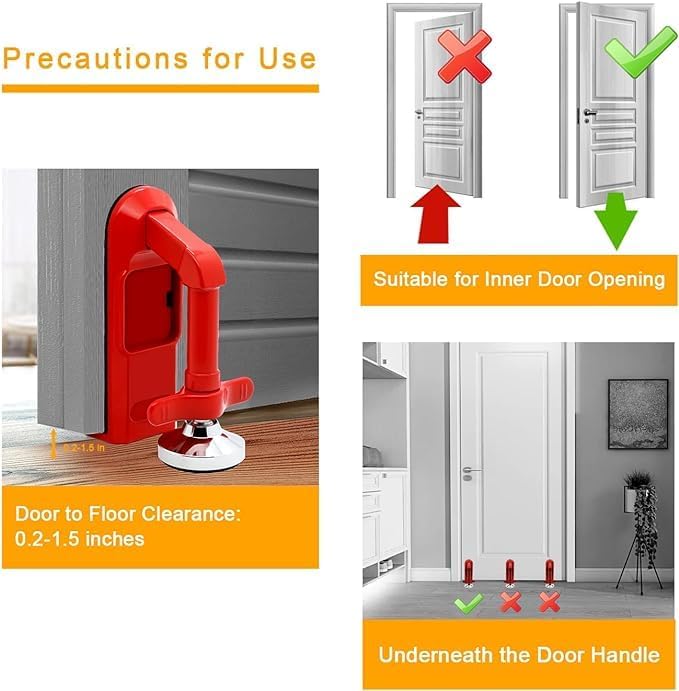 Harmless Installation: Install in seconds and disassemble effortlessly. The door barricade’s contact surface with the door is lined with soft sponge, while the contact surface with the floor is made of plastic, ensuring zero scratches on doors and floors.