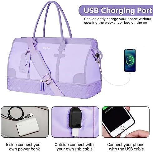 【Large Travel Bag for Women】The travel bag featuring multiple pockets and compartments for stuff organization, roomy space can fit in 3-5 days of travel essentials, easily fit into your clothes, toiletries, shoes, laptop and other items. In the back of the duffle bag there is a pocket for easy access your smart phone, IDs or passport. Equipped a built-in USB charging port, perfect for charging your phone or other devices while Travel.