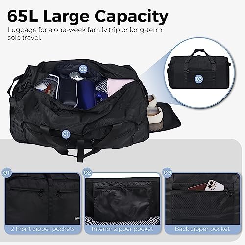 Fmeida 65L Duffle Bag with Shoes Compartment, Foldable Travel Duffel Bags for Men Women, Large Packable Travel Bag Water Repellent & Tear Resistant (Black)