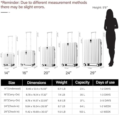 【Product dimensions】Including wheels and handles(can ont expandable),20 inch Carry on luggage airline approved : L13.46 x W8.78 x H21.46″, 37L, 6.8LB,can fit in the overhead bin.