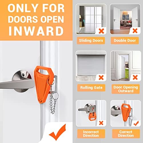 🛒Easy Installation–This portable door lock for travel requires no tools for installation and won’t damage walls or door casings. Winchy door stoppers can be effortlessly installed and removed, even in emergency situations or darkness. Just insert the metal piece into the slot of the door lock, close the door, and then put the orange handle groove to the stud on the metal sheet, then no one can open the door from outside.