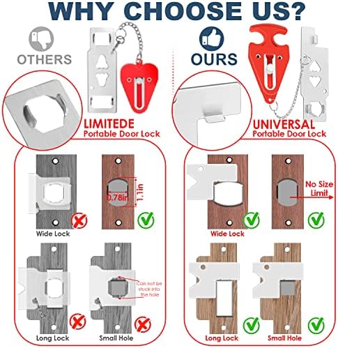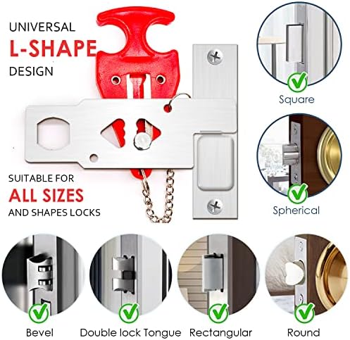 UPGRADE UNIVERSAL L-SHAPED PORTABLE DOOR LOCKS: For portable door locks on the market with only two sizes of holes, there are size restrictions on the length and width of the deadbolt that uses the door lock, and most door locks are not suitable. In response to this problem, our portable door lock adopts a new L-shaped design, which can perfectly fit all door locks and is suitable for door locks of various lengths, widths and shapes.
