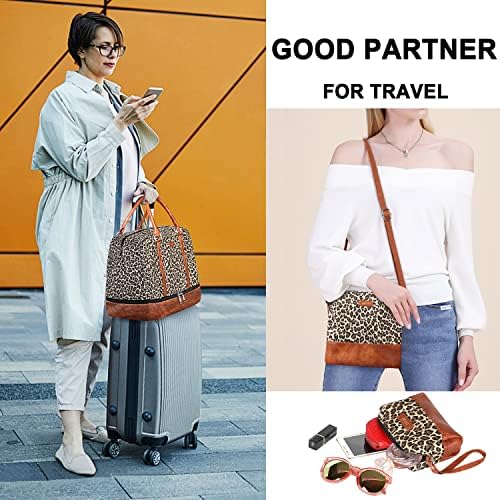 Size of Weekender Bag for Women: 21″L×13″H×9.5″W, Messenger Bag: 10″L×9″W, Storage Bag: 7″L×4.5″W, 2 Adjustable straps up to: 49″-54″. The weekender duffle bag can hold necessities for 2-4 days, a largest 21.5″ laptop, clothes, pants, footwear, cosmetics, toiletries, electronic equipment, etc.