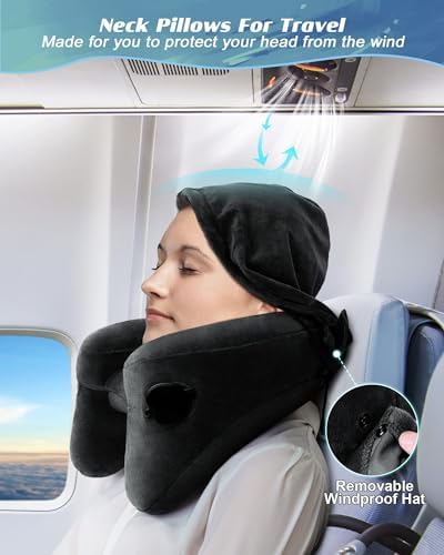 🛫Ergonomic Design: H shape design, our airplane pillow can be used in multiple directions. Traveling pillow can immobilize your neck and prevent head tilt and cervical strain. This hoodie pillow comes with a hood to help isolate light during the flight, prevent eye irritation, and provide protection from the wind when you’re sitting under the air conditioner. It also features adjustable inflation, so you can easily adjust your preferred inflation level and firmness throughout your plane flight.