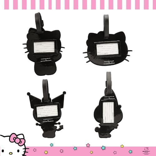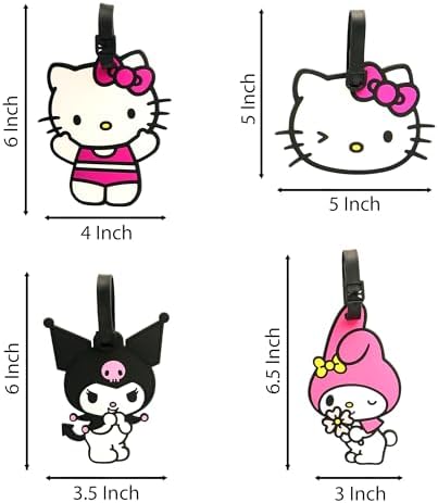 Kuromi, My Melody, and Hello Kitty Designs: Hello Kitty travel bag tags feature four different designs. Bag name tags include one Kuromi suitcase tag, one My Melody luggage tag, and 2 different Hello Kitty bag tags