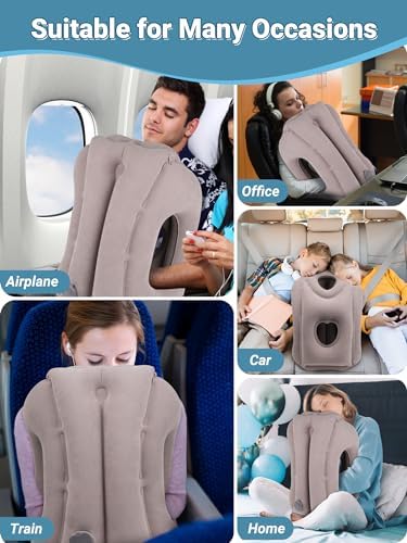 JefDiee Inflatable Travel Pillow, Airplane Neck Pillow Comfortably Supports Head and Chin for Airplanes, Trains, Cars Office Napping on The Tray Table (Grey)