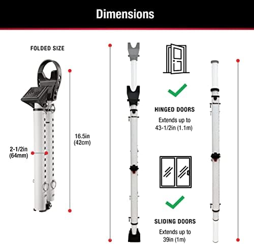 Door security bar features innovative folding design for compact storage and portability, Adjusts from 25-1/2in to 43-1/2in for use on most hinged and sliding doors