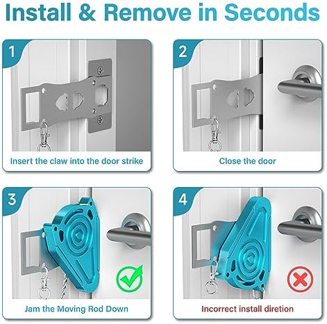 Compact and Portable – The portable lock for the door is a size 5.1 x 1.54 x 0.32 inches. It’s small enough to carry in a pocket or handbag when you are on a business trip or vacation. Using this travel door lock in a hotel or motel can guarantee your safety and privacy, especially at night, you can sleep with peace of mind. Travel door locks for hotel rooms are an ideal door security device when you’re on a business trip or traveling.