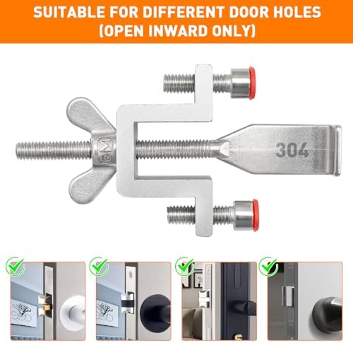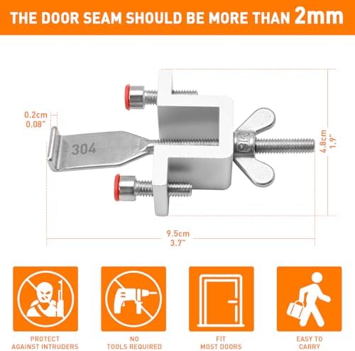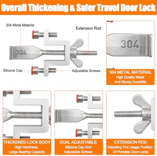 【Overall Thickening & Safer Travel Door Lock】This travel door lock is made of high-quality 304 stainless steel and aluminum alloy, sturdy and long-term use, high hardness, large bearing capacity, not easy to bend and deform. The double nut adjustment design can be adjusted according to the different surface levels of the door and door frame to cover for the level difference. Safe and reliable, providing you with additional protection