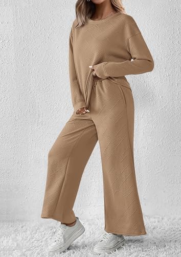 Home Travel Clothing PRETTYGARDEN Women’s 2 Piece Outfits Casual Long Sleeve Pullover Tops and Wide Leg Pants Knitted Lounge Sets