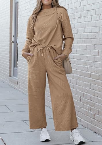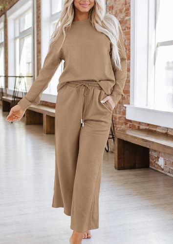 PRETTYGARDEN Women’s 2 Piece Outfits Casual Long Sleeve Pullover Tops and Wide Leg Pants Knitted Lounge Sets