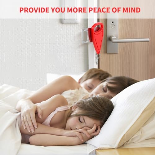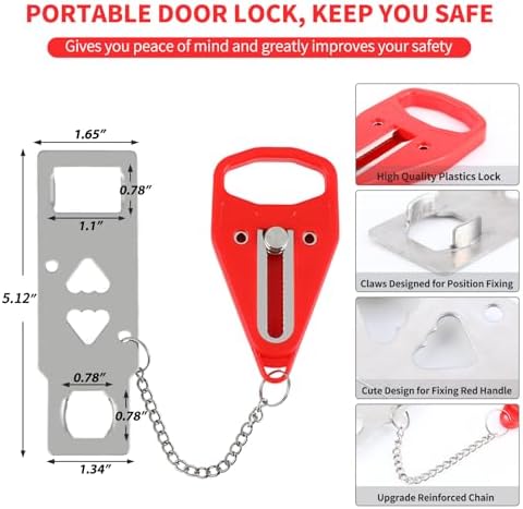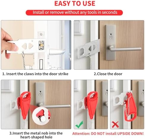 【Quick Installation, Instant Security】Installing the portable door lock is a breeze and requires no tools, drilling, or screws. Simply insert the metal piece into the door lock slot, close the door, and slide the red handle into place. With this secure lock-in position, no one can open the door from the outside. It can be effortlessly installed or removed in seconds, even in emergency situations or low-light conditions.