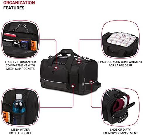 Are you looking for a reliable and spacious travel or workout bag? Look no further than the SwissGear Apex travel and gym bag for women and men. The perfect travel duffel bag for women and men, this rugged workout / weekend bag is made of durable, abrasion-resistant polyester made to withstand heavy use and harsh conditions. An ideal overnight bag for women and men, this packable duffle bag features a zipper closure and a large main compartment, 2 end pockets, and a front organizer pocket for storing writing utensils, snacks, and keys. Plus, it has a stretch mesh water bottle pocket to help you remain hydrated. The top bungee-cord storage system is perfect for quickly storing items, such as a light jacket or an umbrella. You can also lift and maneuver this workout / weekender bag for women and men using the reinforced top and side handles, or throw it over your shoulder with the removable, adjustable shoulder strap to enjoy hands-free mobility. The SwissGear Apex Travel Duffle Bag is the perfect solution for your travel needs. With this carry-on duffel bag, you can travel with convenience.