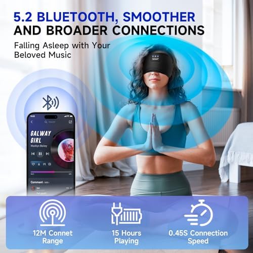 𝟓.𝟐 𝐁𝐥𝐮𝐞𝐭𝐨𝐨𝐭𝐡 𝐒𝐥𝐞𝐞𝐩 𝐌𝐚𝐬𝐤 𝐇𝐞𝐚𝐝𝐩𝐡𝐨𝐧𝐞𝐬 – Ensure 15 hours (2 nights) of uninterrupted sleep with our sleep mask with bluetooth headphones. Experience smooth calls and audio playback within a 12-meter range. Connect in just 0.45 seconds to instantly play soothing music, effectively blocking snoring and other disturbances.