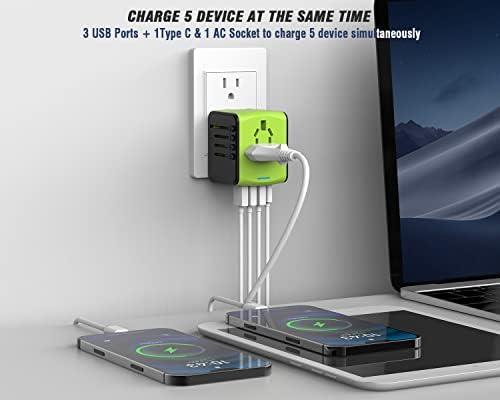 【Fast USB-C Charger】-3 x USB-A Each Output 5V 2.4A max , 1 USB Type C port 3A/5V output, and 1 AC Universal Socket to charge 5 devices simultaneously with high speed. 4 AC power plug sockets – Output: 880W at 110V, 2000W at 250V.