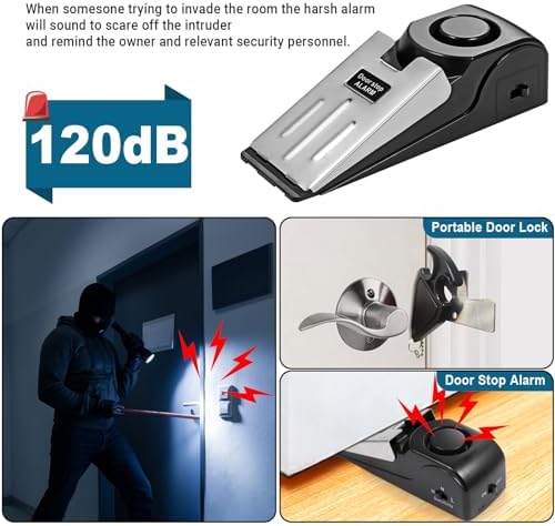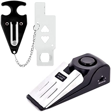 Door Stop Alarm: This is an upgrade door stop than others,Stainless steel pressure plate,non-slip bottom,3 Sensitivity Levels – Low – Medium – High,with 120DB siren, Once someone opens the door,the door stopper alarm will go off in the first place,they will scaring away bad guys and helps wake you and give you time to find help.Require one 9v battery (Not include)