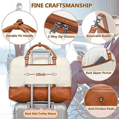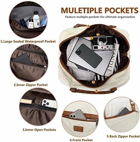 【Perfect 4PCS Weekender Bag】The travel weekender bag comes with $18 toiletry bag, 2 adjustable & detachable shoulder straps,card pocket and shoe compartment. This weekend bag is crafted with waterproof premium soft canvas and PU leather material, Durable and not easy to wear. Perfect for men and women to use in daily travel or business trip,meet the flight regulations and requirements for carry on luggage.