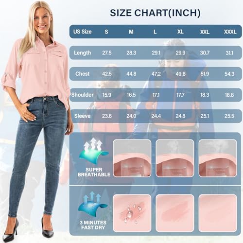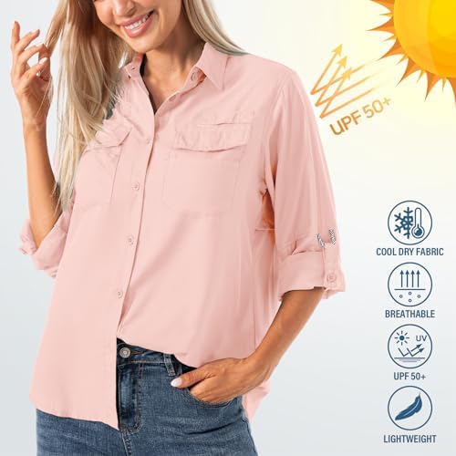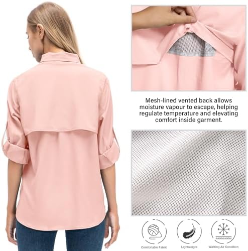 Women’s long sleeve sun protection shirts can protect you from sun protection when you are hiking, camping, traveling, fishing, climbing, gardening, suitable for Spring/Summer/Autumn, making it the ultimate active travel shirt.UPF 40+ sun protection fiber blocks UVA and UBA ray to help prevent sunburn and skin damage during long hours in the sun, Quick dry lightweight fabric and air back vent wicks away moisture and dries quickly for ultimate breathability and comfort.Women’s convertible fishing shirt features buttons at arms to convert long sleeves to short sleeves for hotter days.Women’s button dowm PFG shirts features a relaxed, casual fit for maximum comfort during outdoor activities.