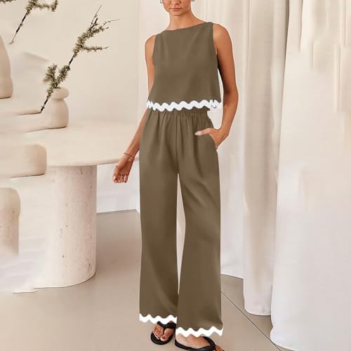 Linen Set for Women Casual Summer Outfits Matching Crop Top and Pant Set Tank Wide Leg Lounge Set with Pockets