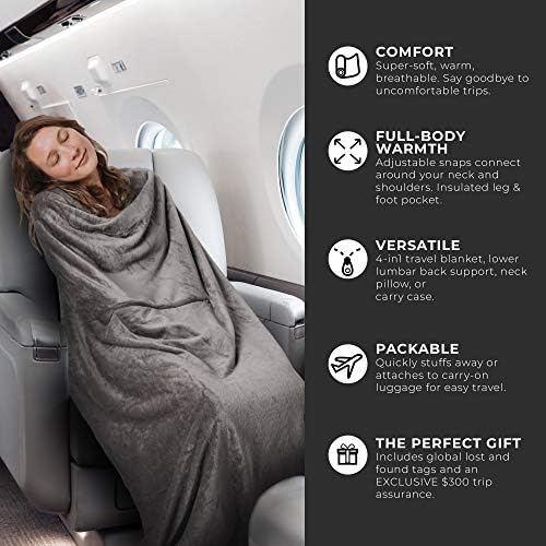 ELIMINATE THE STIFF NECK: Travel blanket converts into a comfy pillow to fully support your neck. Innovative design also includes a built in luggage sleeve for ease of travel.