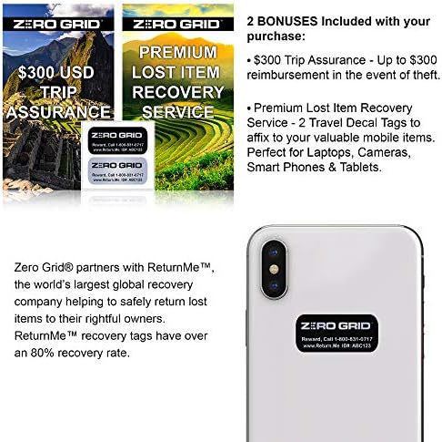 **BONUS #2 ** GLOBAL LOST & FOUND TAGS – Each Zero Grid Travel Money Belt includes 2 Recovery Tags from ReturnMe, the world’s largest lost & found company. Stick these on your phone, laptop, camera, passport, etc and their 24/7 call center will help return lost items from anywhere in the world. By purchasing this pickpocket proof wallet from Zero Grid, this service is FREE for life.